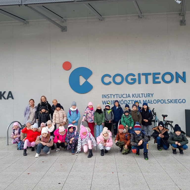 Przygodę rozpoczęliśmy od Małopolskiego Centrum Nauki „Cogiteon”, gdzie obejrzeliśmy wystawę pt.„Człowiek i jego marzenia” podzieloną na 5 obszarów tematycznych. Dzieci miały okazję do samodzielnego eksperymentowania i poznawania, zgodnie ze swoimi zainteresowaniami i potrzebami. Pierwsza część wystawy, od której rozpoczęliśmy naukową podróż, opowiadała o zdrowiu i tajemnicach ludzkiego organizmu. Dzieci dowiedziały się m.in.: jak działają nasze narządy, jak się zmieniamy w ciągu życia oraz jak nasz organizm radzi sobie z zagrożeniami. W drugiej części wystawy pt. „Co nasz łączy” odkryliśmy, jak powstały społeczeństwa i cywilizacje, jak inne osoby odczuwają świat oraz jak komunikujemy się w Internecie i poza nim. W kolejnej sali pt. „Jak działa świat” badaliśmy otaczającą nas rzeczywistość, obserwowaliśmy kosmos i przyrodę. Następnie przeszliśmy do wystawy zatytułowanej „Jak zmieniamy Ziemię”, gdzie dowiedzieliśmy się, skąd czerpiemy pomysły na wynalazki i jak powstają nowe technologie, jak przetwarzamy energię, jak budujemy miasta, jak powstaje pożywienie oraz jaki wpływ na planetę mają rolnictwo i przemysł. Ostatnia część wystawy „Jak to sobie wyobrażasz” była poświęcona pomysłowości i wyobraźni. W tej części dzieci eksperymentowały ze światłem, ruchem i dźwiękiem. Wizyta w Centrum Nauki była okazją do lepszego poznania człowieka i świata oraz zależności pomiędzy nimi.