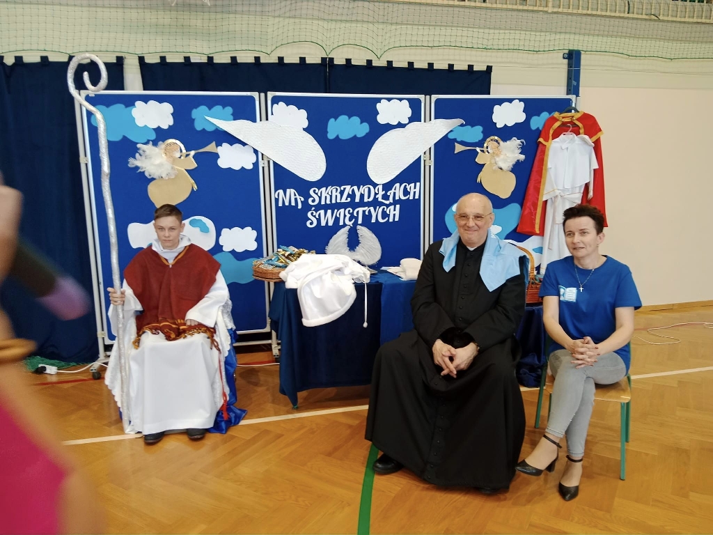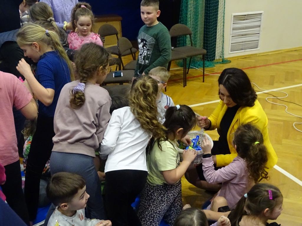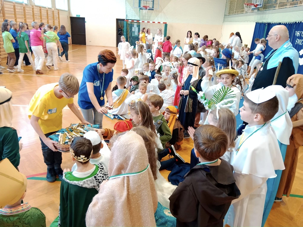 Po Mszy świętej głos zabrała pani Barbara Duran oraz pani dyrektor Bożena Brzęczek, dziękując za przybycie oraz ogłaszając wyniki konkursu “Góra cukierków”. Dla zwycięskich klas nagrodą były przepiękne statuetki w kolorach złotym, srebrnym i brązowym. Gratulujemy! Specjalnym gościom wręczono baranki, a podopiecznym stowarzyszenia - chlebki. Następnie odbyła się część artystyczna. Najpierw usłyszeliśmy piękny śpiew “Małej Armii Jana Pawła II”, a następnie wolontariusze wraz z panią Pauliną Kordelą wykonali taniec do motywującej piosenki “Jesteś super!”. Nie mogło również zabraknąć gorącego posiłku dla wszystkich gości. Po posiłku, przyciągało gości na parkiet wiele zabaw tanecznych przygotowanych przez panią Paulinę. W taki oto sposób zakończył się ten tak ważny dla nas wszystkich dzień, pełen radości i niezapomnianych wrażeń. Do przygotowania tej uroczystości dużo serca i pracy wnieśli wolontariusze, nauczyciele i pracownicy szkoły. Wszystkim obecnym dziękujemy za przybycie!