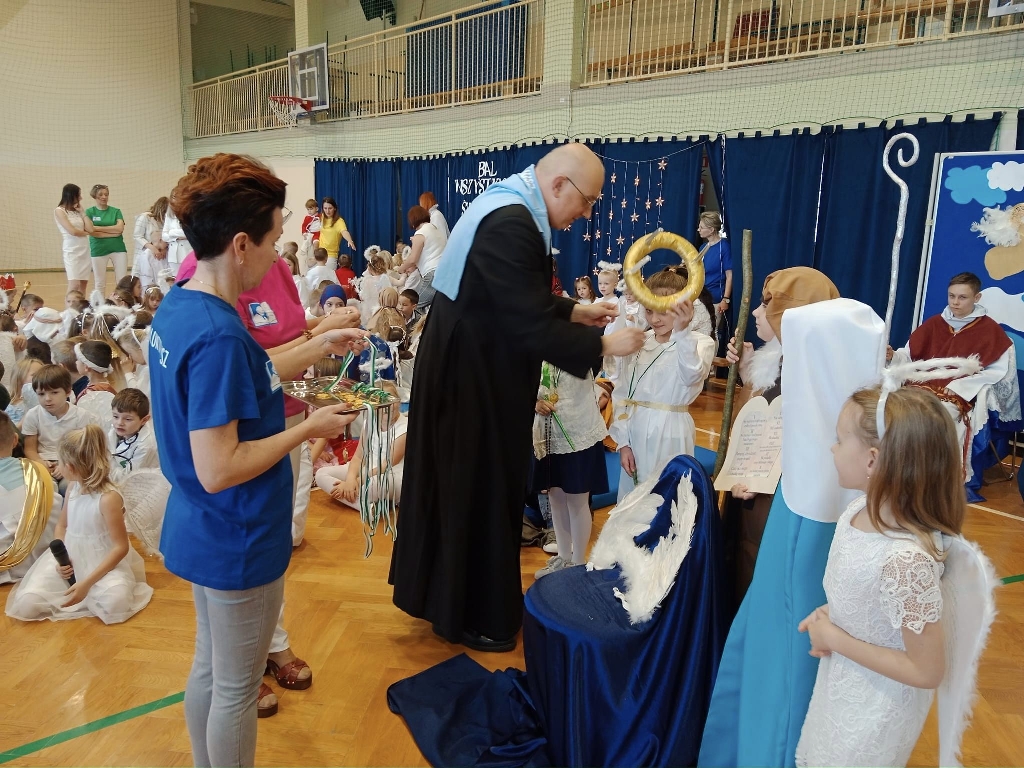 Tego dnia było jak w niebie… maleńkie Aniołki stworzyły niebiańską atmosferę natomiast starsze dzieci ubrały się w stroje nawiązujące do postaci świętych, błogosławionych bądź przyniosły rekwizyty nawiązujące do swych patronów. Rozpoczęty bal tańcem Poloneza przeszedł nasze wszelkie oczekiwanie, przepiękne stroje dzieci, para za parą… długi, krótki, krótki szepcąc po cichu, to było niesamowite.