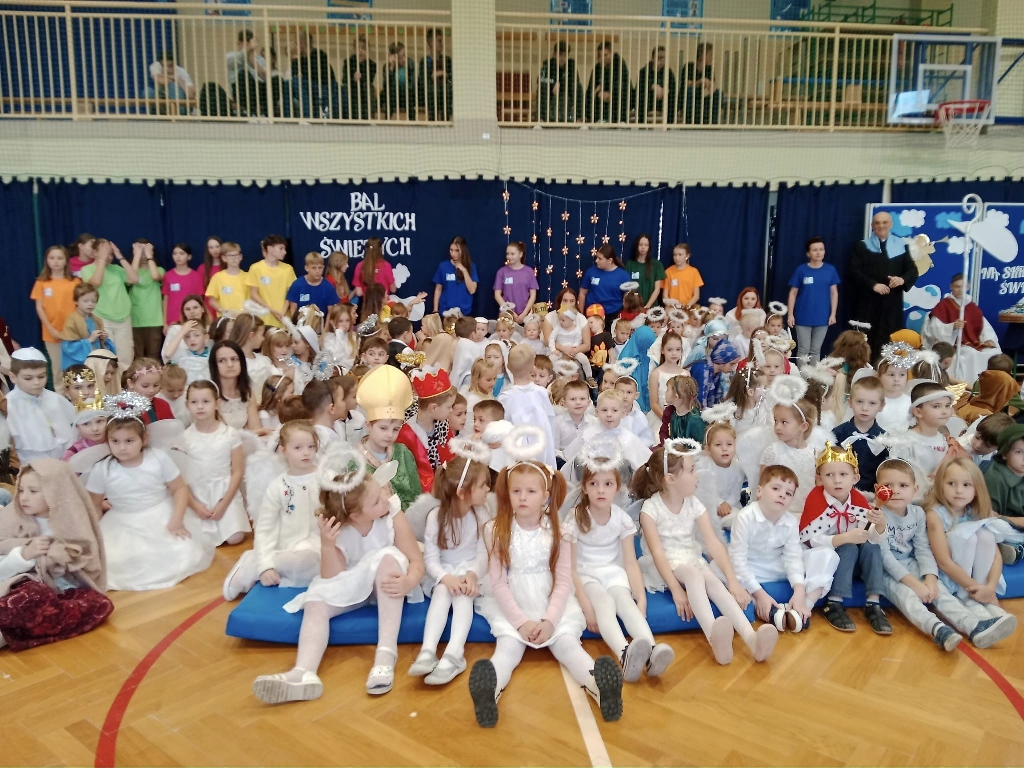 Na balu nie mogło zabraknąć dobrej zabawy. Dzieci wesoło bawiły się przy dźwiękach muzyki w towarzystwie dyrektor szkoły Pani Bożeny Brzęczek, księdza proboszcza Dariusza Nawalańca i Nauczycieli. Ideą balu była wspólna, radosna zabawa promująca wartości, którymi w życiu kierowali się święci i błogosławieni godni do naśladowania np. święty Jan Paweł II, święty Jerzy, święty Antoni, święty Franciszek, Matka Boża, święty Józef, święta Hiacynta, święta Jadwiga, święta Łucja, bł. Karolina, święty Kacper, Mojżesz i wielu świętych wspaniałych dzieci. Każde dziecko otrzymało coś słodkiego a wybrani uczniowie za swoja prezentację otrzymali wyróżnienie ŚWIETY NA MEDAL.