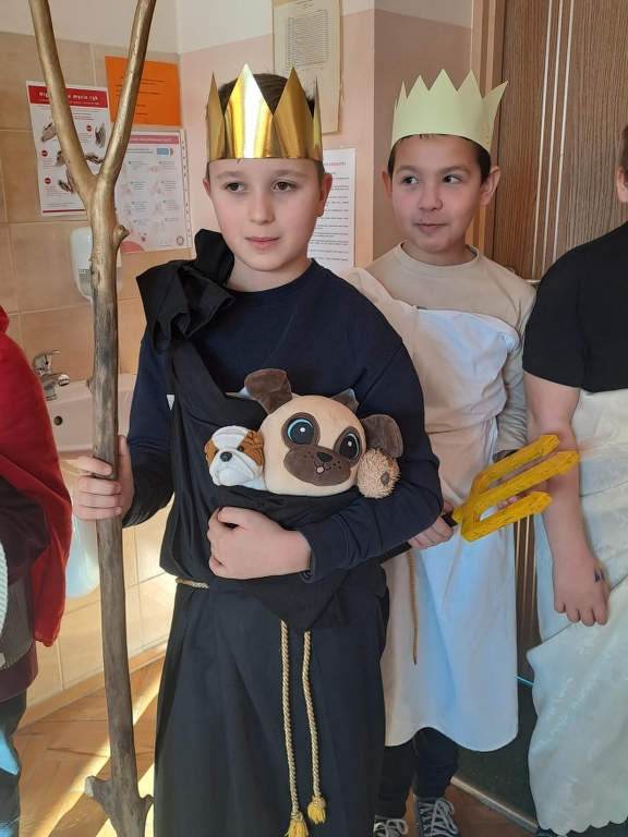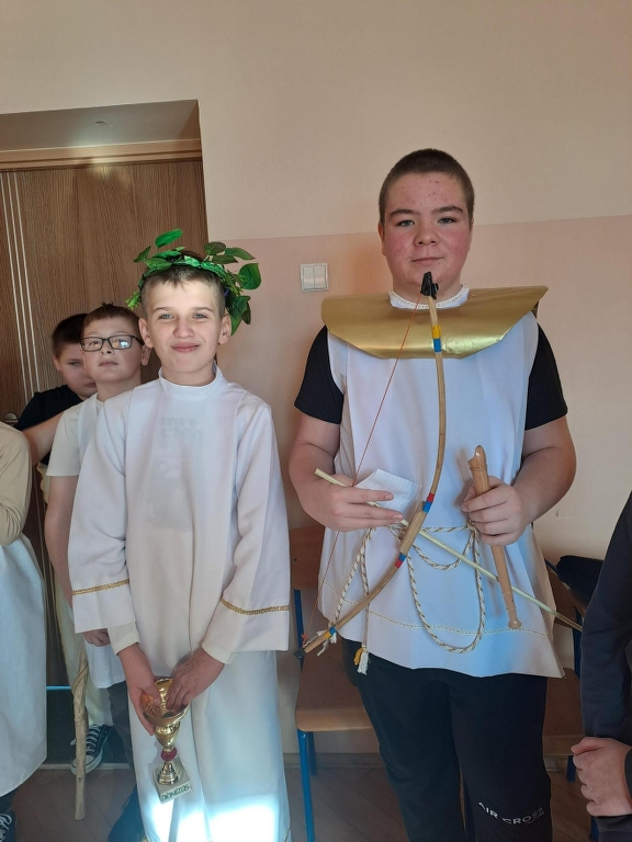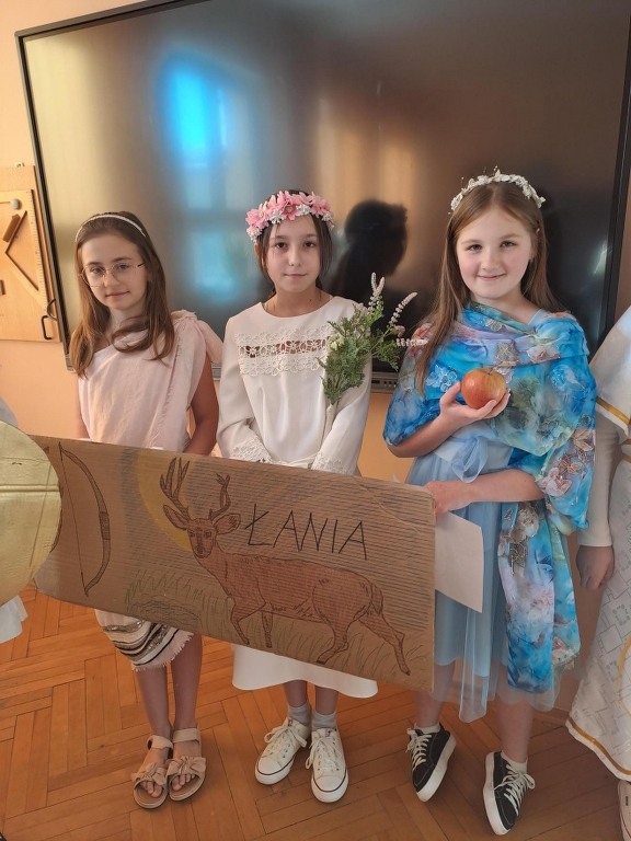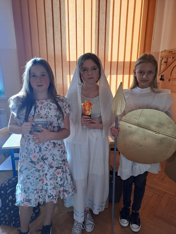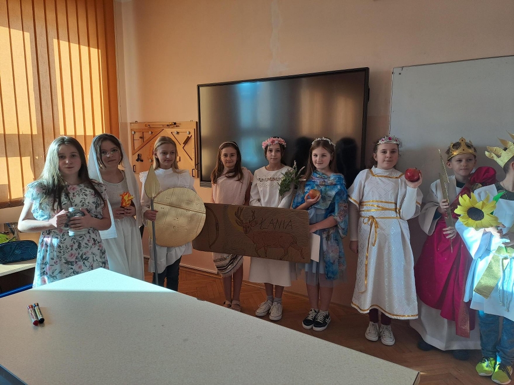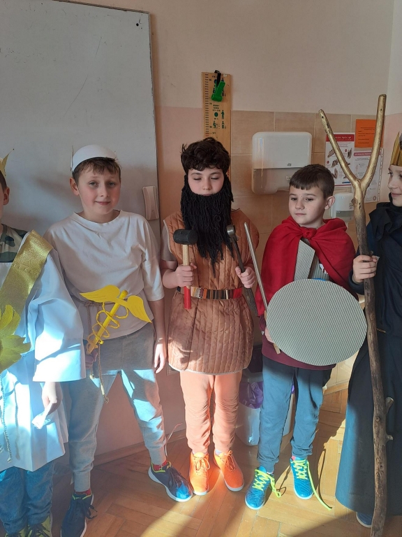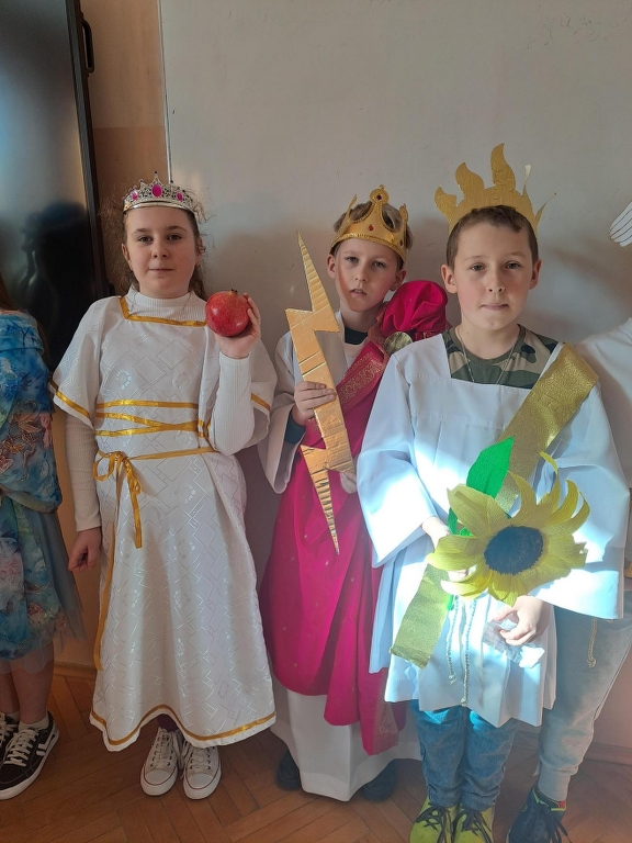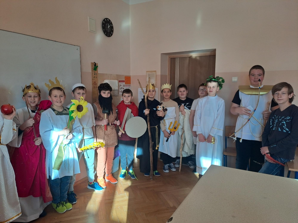 Na podsumowanie omawiania mitów greckich uczniowie klasy 5b wzięli udział w międzyprzedmiotowym projekcie z języka polskiego i historii. Każdy uczeń miał zaprezentować wylosowanego boga greckiego – wcielić się w tę postać i opowiedzieć o niej. W tym celu uczniowie przygotowali stroje, atrybuty i dodatki wykorzystując kolorowe tkaniny, papier, sztuczne kwiaty, owoce, przedmioty codziennego użytku czy maskotki (z tych ostatnich powstał pluszowy trójgłowy Cerber, który przybył z Hadesem). Piątoklasiści swoją wiedzą podzielili się z uczniami innych klas. Udział w projekcie był okazją do usystematyzowania i poszerzenia wiedzy o wierzeniach starożytnych Greków oraz świetną zabawą.