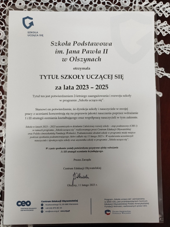 - Certyfikat Szkoły Uczącej Się (11.02.2025)