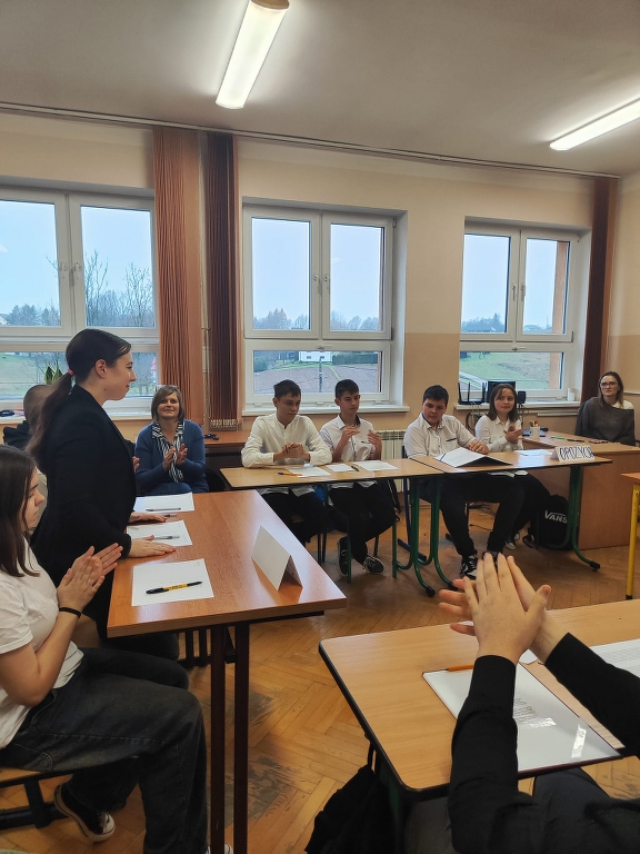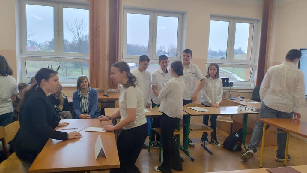 Debata Oksfordzka w wykonaniu klasy 8 w ramach zadania edukacyjnego realizowanego na lekcji wiedzy o społeczestwie.