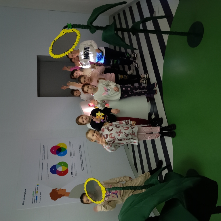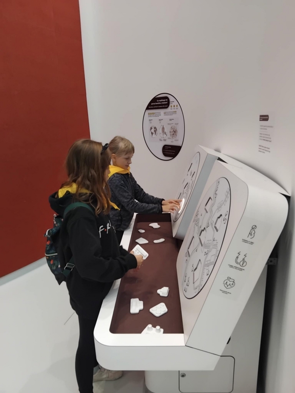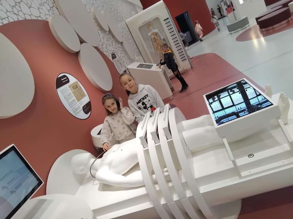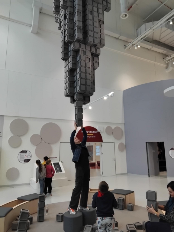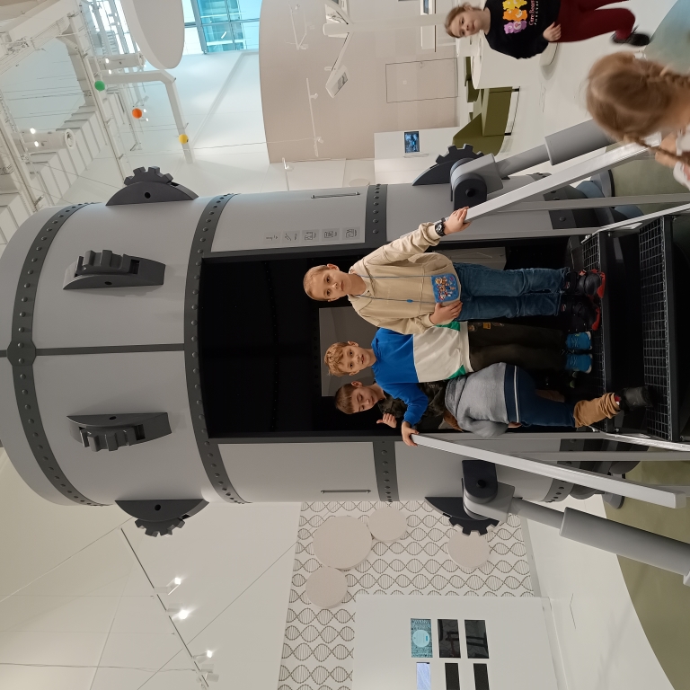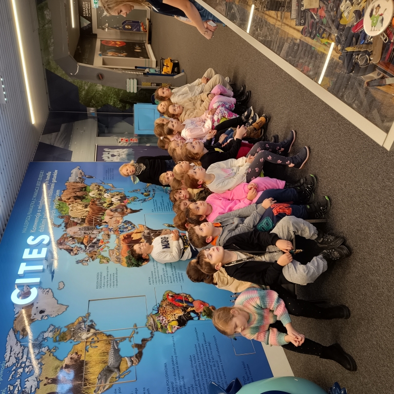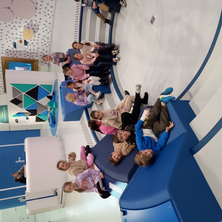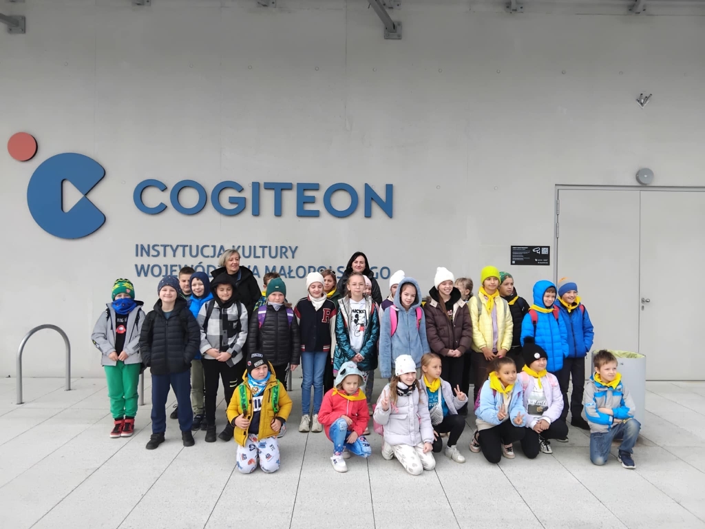 Przygodę rozpoczęliśmy od Małopolskiego Centrum Nauki „Cogiteon”, gdzie obejrzeliśmy wystawę pt.„Człowiek i jego marzenia” podzieloną na 5 obszarów tematycznych. Dzieci miały okazję do samodzielnego eksperymentowania i poznawania, zgodnie ze swoimi zainteresowaniami i potrzebami. Pierwsza część wystawy, od której rozpoczęliśmy naukową podróż, opowiadała o zdrowiu i tajemnicach ludzkiego organizmu. Dzieci dowiedziały się m.in.: jak działają nasze narządy, jak się zmieniamy w ciągu życia oraz jak nasz organizm radzi sobie z zagrożeniami. W drugiej części wystawy pt. „Co nasz łączy” odkryliśmy, jak powstały społeczeństwa i cywilizacje, jak inne osoby odczuwają świat oraz jak komunikujemy się w Internecie i poza nim. W kolejnej sali pt. „Jak działa świat” badaliśmy otaczającą nas rzeczywistość, obserwowaliśmy kosmos i przyrodę. Następnie przeszliśmy do wystawy zatytułowanej „Jak zmieniamy Ziemię”, gdzie dowiedzieliśmy się, skąd czerpiemy pomysły na wynalazki i jak powstają nowe technologie, jak przetwarzamy energię, jak budujemy miasta, jak powstaje pożywienie oraz jaki wpływ na planetę mają rolnictwo i przemysł. Ostatnia część wystawy „Jak to sobie wyobrażasz” była poświęcona pomysłowości i wyobraźni. W tej części dzieci eksperymentowały ze światłem, ruchem i dźwiękiem. Wizyta w Centrum Nauki była okazją do lepszego poznania człowieka i świata oraz zależności pomiędzy nimi.