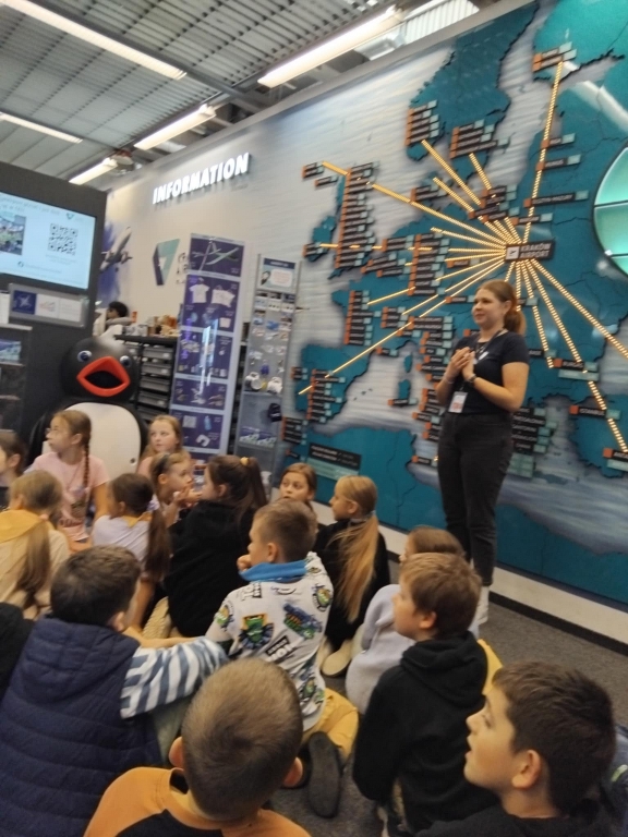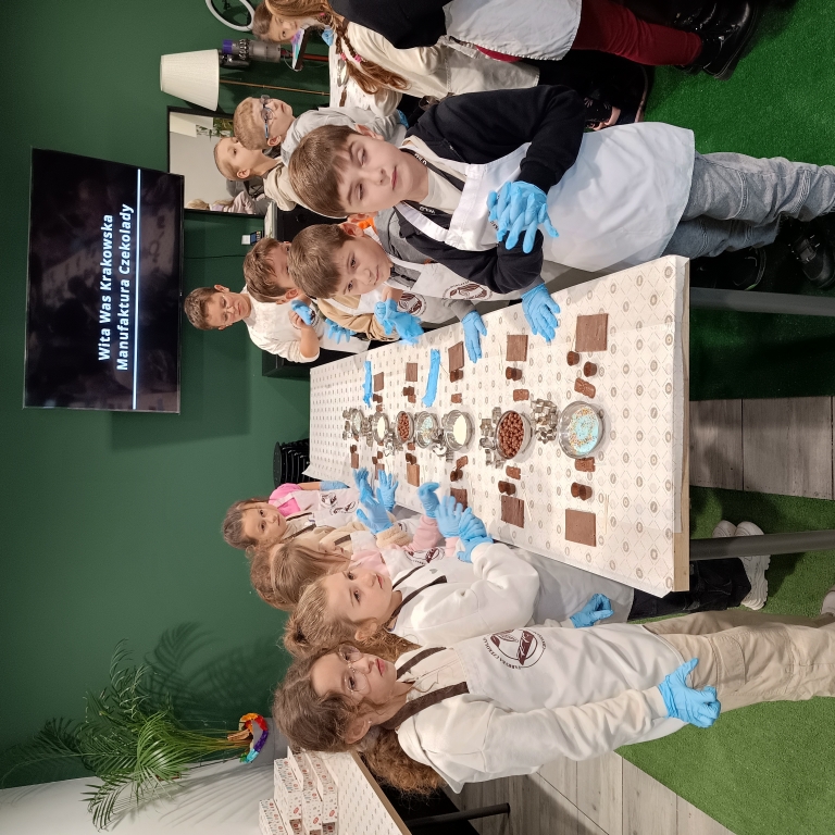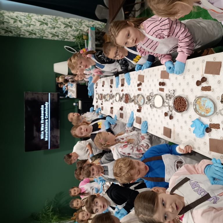 W pierwszym dniu wspólną przygodę uczniowie rozpoczęli od warsztatów czekoladowych w Krakowskiej Manufakturze Czekolady, gdzie poznali proces powstawania czekolady. Dzieci miały okazję samodzielnie tworzyć czekoladki, co sprawiło im wiele radości, a efekty ich pracy mogły zabrać do domu. Zajęcia były pełne słodkiej zabawy i kreatywności. Następnie uczniowie udali się do Centrum Edukacji Cogiteon, gdzie uczestniczyli w ciekawych warsztatach edukacyjnych. Tematyka zajęć była dostosowana do wieku dzieci i pozwalała im na interaktywne zdobywanie wiedzy. Zajęcia wzbudziły duże zainteresowanie i zachęciły do dalszego odkrywania świata nauki. Kolejnym punktem programu były warsztaty w Centrum Edukacji Lotniczej pod nazwą „Lotnisko live – Ścieżka Pasażera”. Dzieci mogły poznać kulisy funkcjonowania lotniska i dowiedzieć się, jak wygląda podróż z punktu widzenia pasażera – od odprawy, przez kontrolę bezpieczeństwa, aż po wejście na pokład samolotu. Zajęcia były bardzo angażujące i pełne nowych wrażeń.